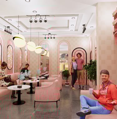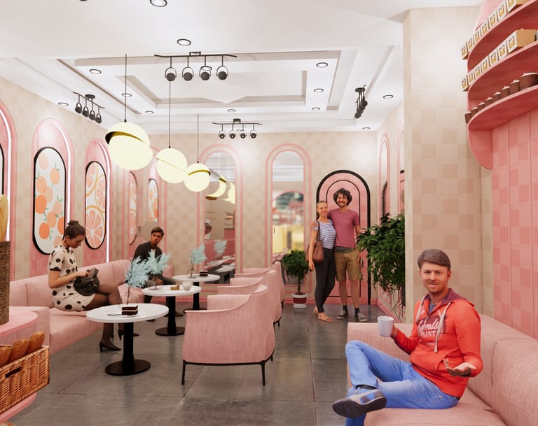 تصميم داخلي لمقهى دافئ وجذاب مع لمسة ريفية. يتميز هذا التصميم بإضاءة دافئة ومقاعد مريحة لخلق جو ترحيبي للعملاء.
